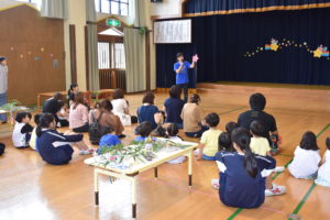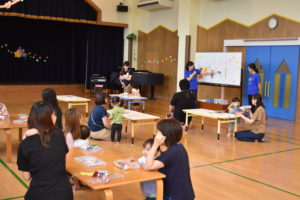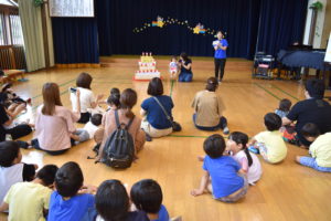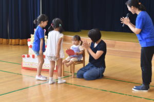 7,8月生まれの誕生会では、年長さんが誕生会の首飾りをかけてくれたり、歌をうたったりして、みんなでお祝いしました♫ 夏の太陽のようにキラキラ輝いて、元気いっぱい大きくなってね♪