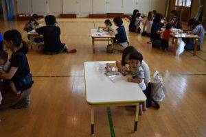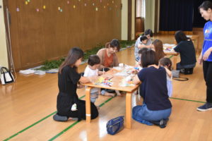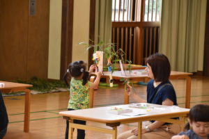 7月7日の七夕を目前に、一足早く七夕を楽しもうと、幼稚園の裏庭「ふれあいの森」で切ってきた、新鮮な笹を遊戯室に並べて、準備万端!! 12組の親子のみなさんが来てくださいました!