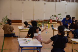 スイカの飾りに種を描いたり、星形☆に顔を描いて流れ星を作ったり、短冊に願い事を書いたり…。 色とりどりの飾りを笹に結び付けたら、サラサラ涼しげに揺れる素敵な七夕飾りが出来ました!! みなさんの願いが届くといいですね⋰⋰☆⋰⋰