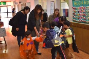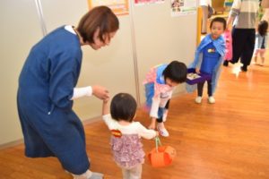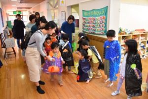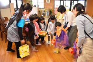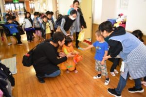 園内で出会った年長さんも、ハロウィンの変装バッチリ!この日のために製作したお菓子を、行く先々でお兄さん、お姉さんがちびっこたちのかぼちゃバッグに入れてくれました!
