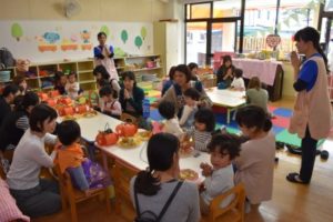 ぐるりと園内のパレードからお部屋に帰ってきたら、いよいよお待ちかねのおやつタイムです。 今回は、園の畑で芋ほりをした、おいものチーズ乗せ焼きと、かぼちゃの蒸しケーキでした。