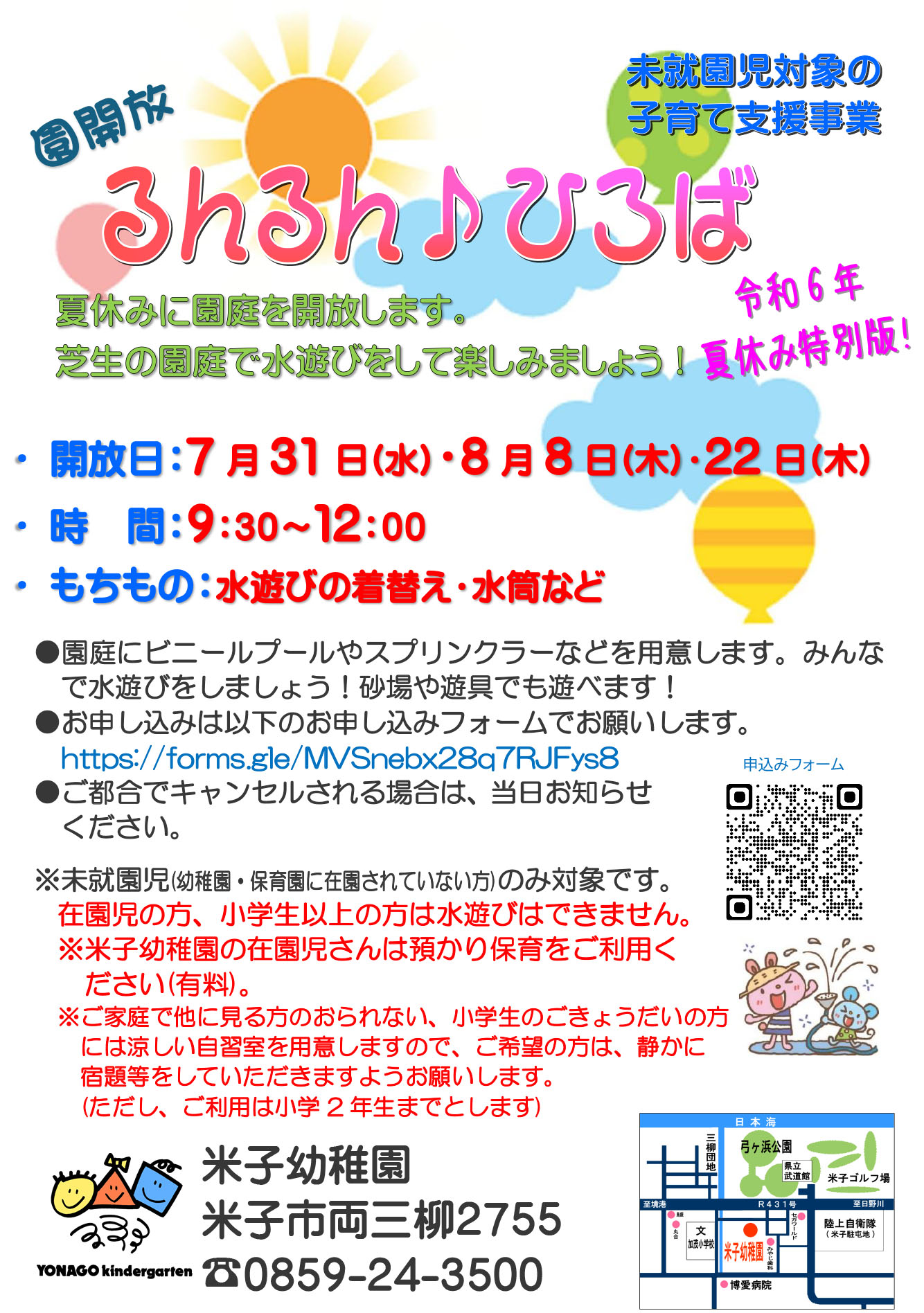 ※未就園児(幼稚園・保育園に在園されていない方)のみ対象です。 在園児の方、小学生以上の方は水遊びはできません。