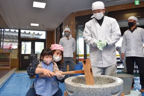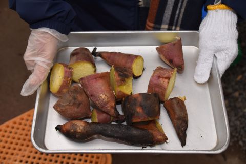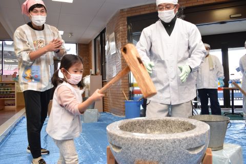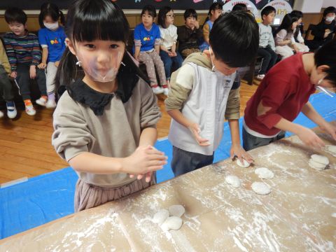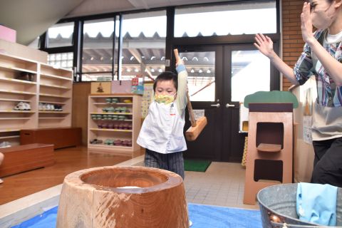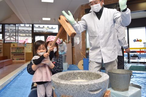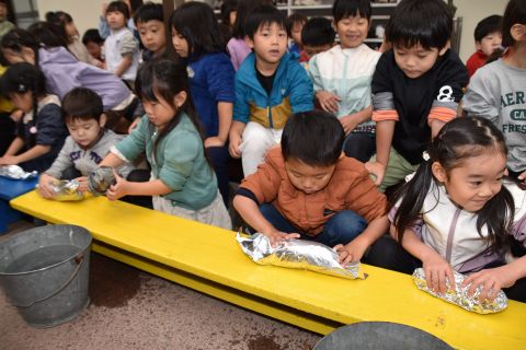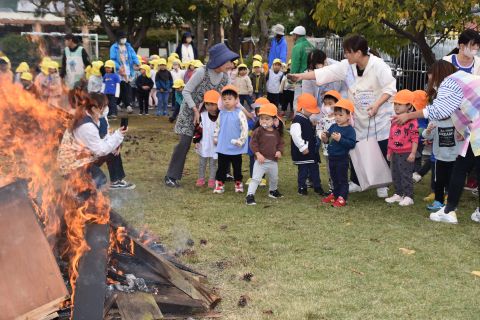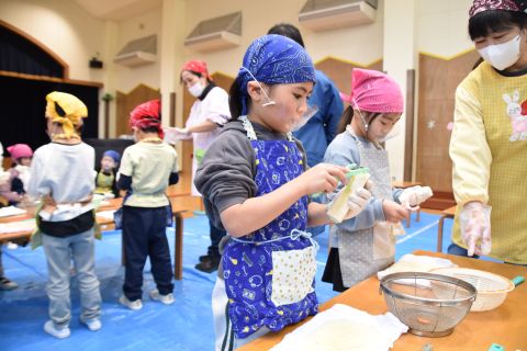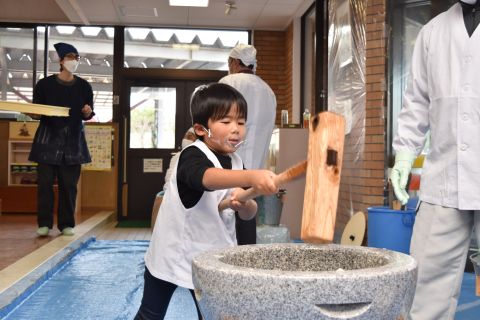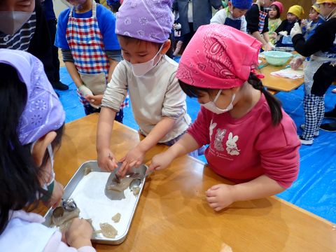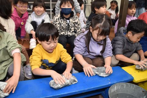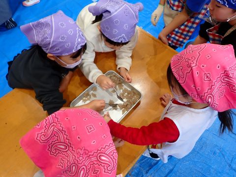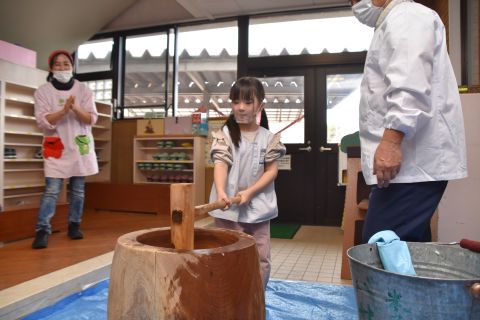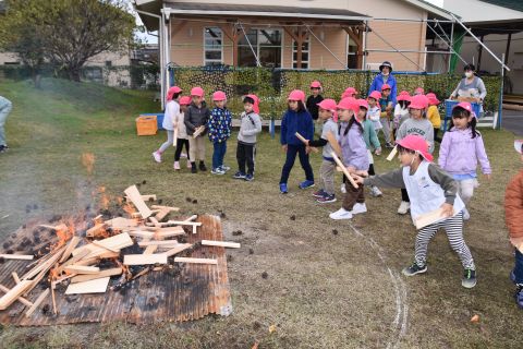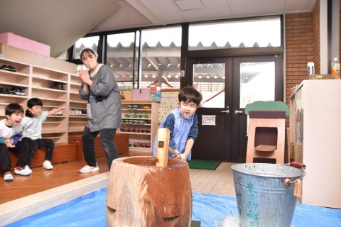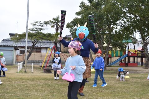 子どもたちは強い心で力を合わせて、豆を「鬼は外!福は内!」と力いっぱい投げました。