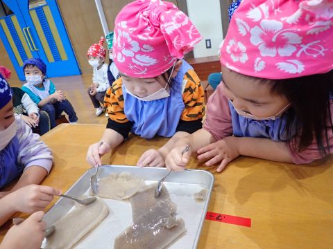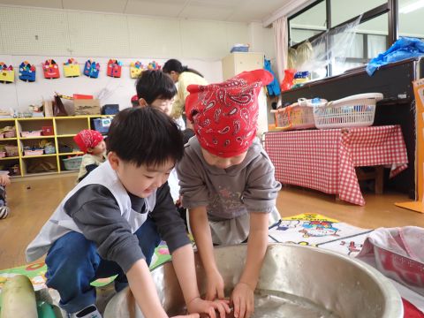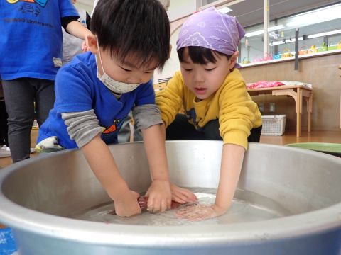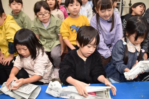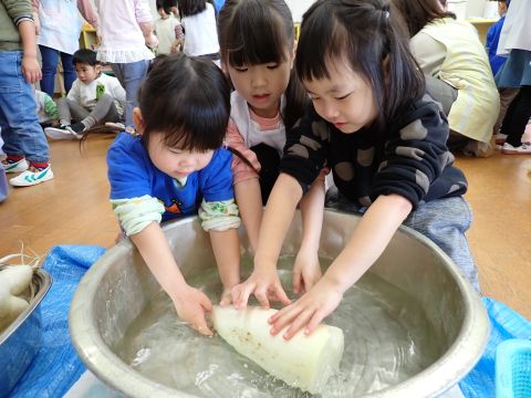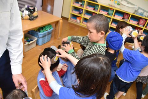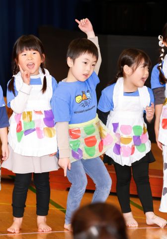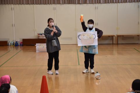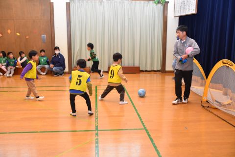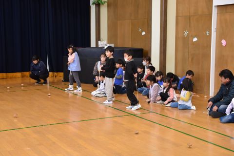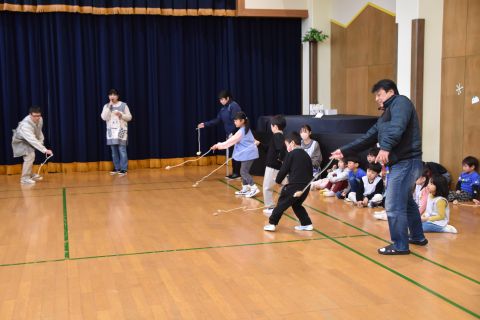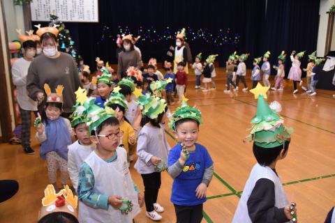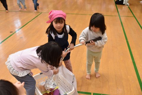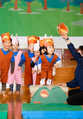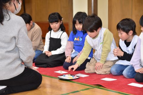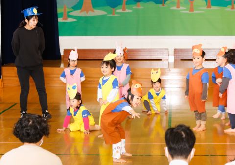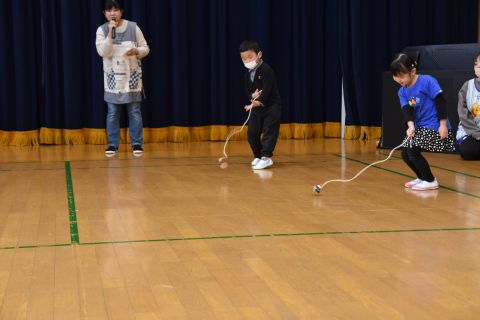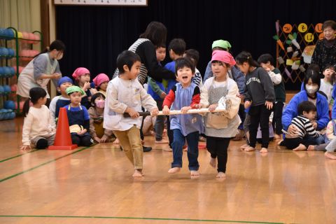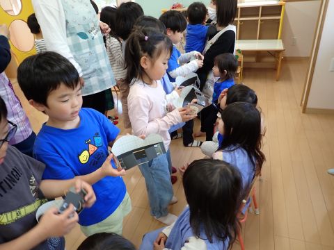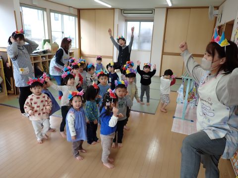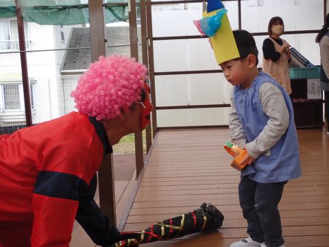 遊戯室では、園児たちが先生と一緒に手遊びをしたり、先生の出しものを見て楽しみました。笑い声が遊戯室いっぱいに響き渡りました。