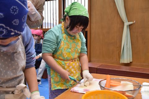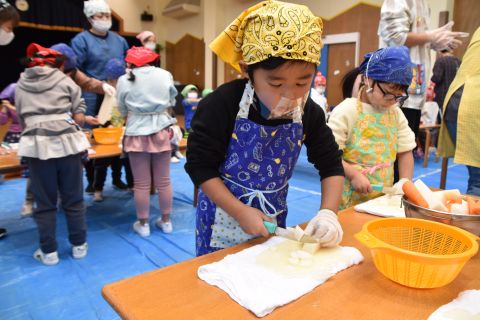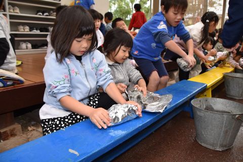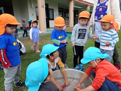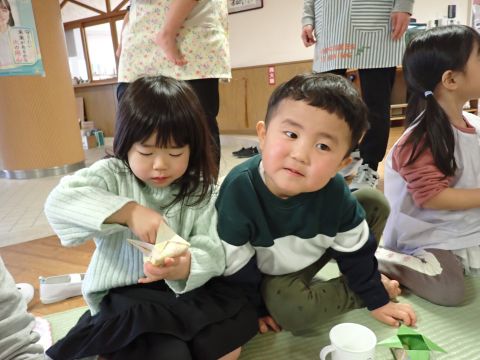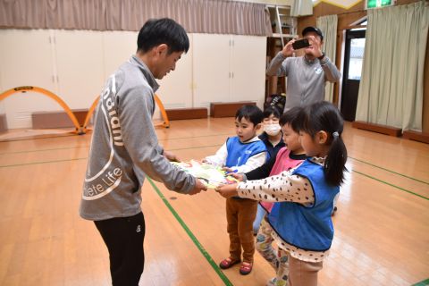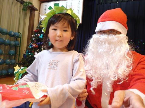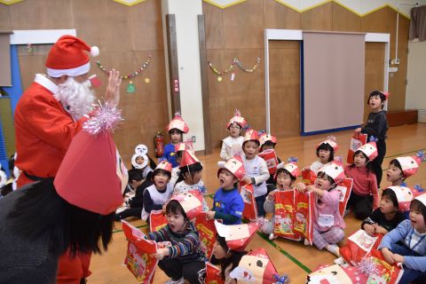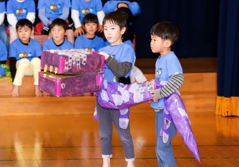 年長のお兄さんお姉さんたちは、小さい組のお友だちに手作りのプレゼントを渡して、温かい気持ちを伝えました。