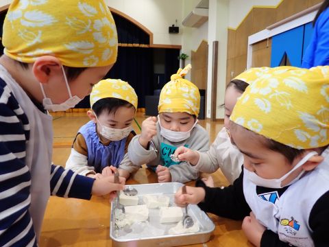 今日はみんなで豆まき大会をしました。