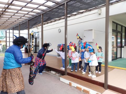 最初に年長組の子どもたち扮する鬼が、ちいさい組の子どもたちの教室を回りました。