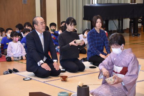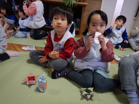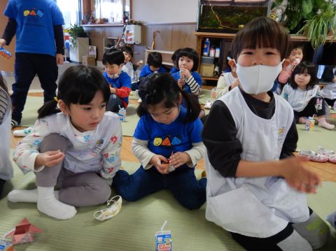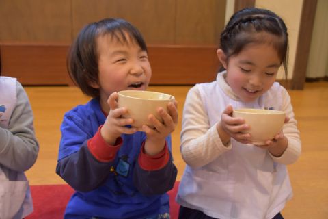 ひな祭り(2021/03/03) 今日はひな祭り!年長組の子どもたちは遊戯室でお茶を点てるところを見たり、ひな祭りの音楽を聴いて雰囲気を感じながらお茶菓子とお抹茶をいただきました。子どもたちは、顔をしかめながらも「にがいけどおいしい。」とお茶の時間を楽しみました。年中組・年少組・ひよこ組は各学年でひなあられを食べたり、白酒代わりのハイピスを飲んでお祝いをしました。みんなにとって楽しいひな祭りになりました。