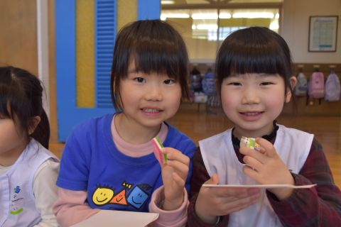 新入園児歓迎会(2021/04/14) みんなで、新入園児の歓迎会をしました。先生の出し物を観たり、年長組のお兄さんお姉さんが、小さい組のお友だちのために作ったプレゼントを渡したりして、とっても楽しい一日を過ごしました。