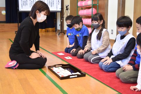 コマ回し大会(年長)(2021/01/26) 年長組の子どもたちでコマ回し大会を行いました。3学期になってから、昨年クリスマスプレゼントとしてサンタさんからもらったコマを園に持ち寄り、みんなでコマ回し大会に向けて練習をしました。園長先生や運転手さんを巻き込んでコマの回し方を教わりました。今日は、遊戯室で園長先生や運転手さんをオブザーバーとして迎え、競技を行いました。園長先生や運転手さんも一緒になって競技をしました。子どもたちは、大人たちがみんな敗退するほどの腕前になり、とっても満足していたようです。