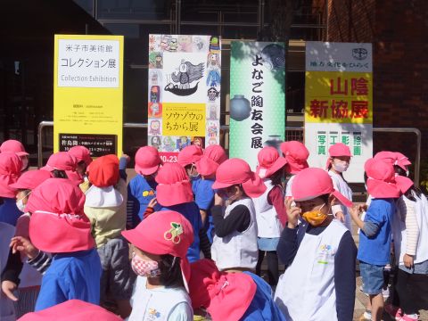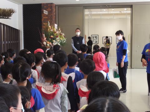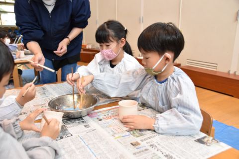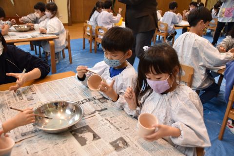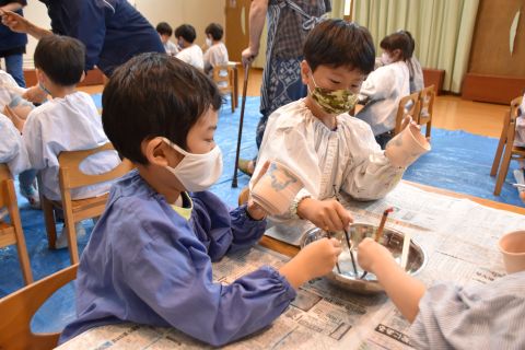 法勝寺焼皆生窯の安藤先生にご指導いただきながら、年長の子どもたちが湯呑みに絵付けをしました。