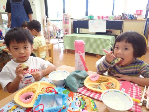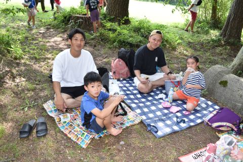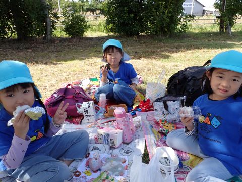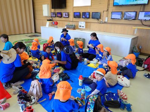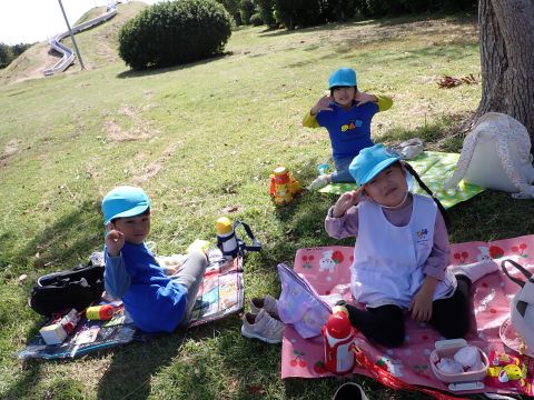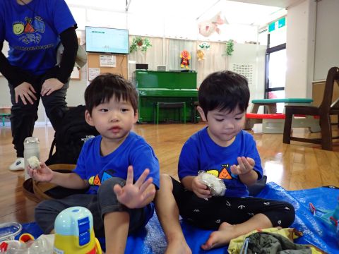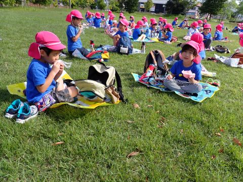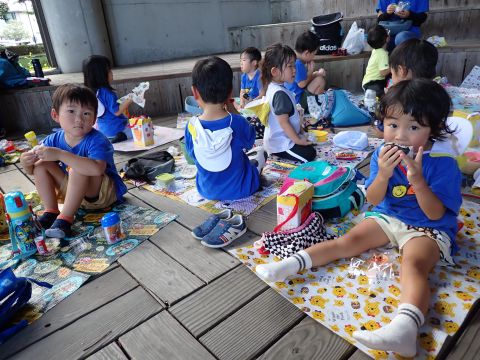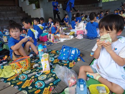 暑さ対策の為、お弁当やおやつは園に帰ってからブルーシートを敷いて食べました。いつもと違う所で食べたので、特別感があったようですよ。