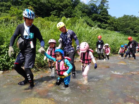 ダイナミックな大自然の中、年長組の保護者の皆様にご協力いただき、年長児たちが川の中を歩きました。