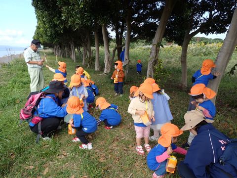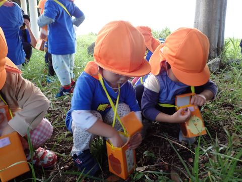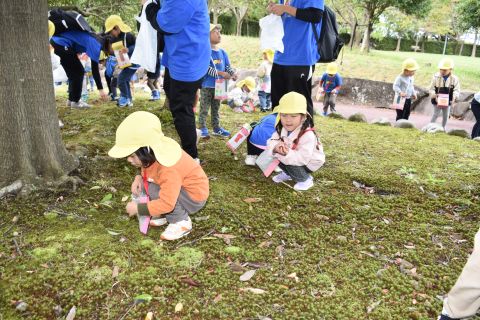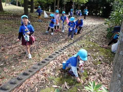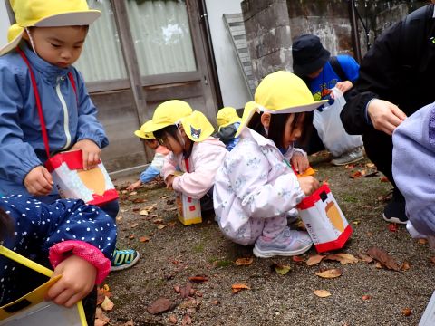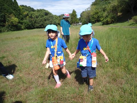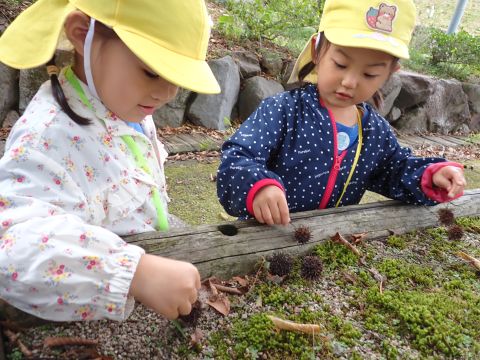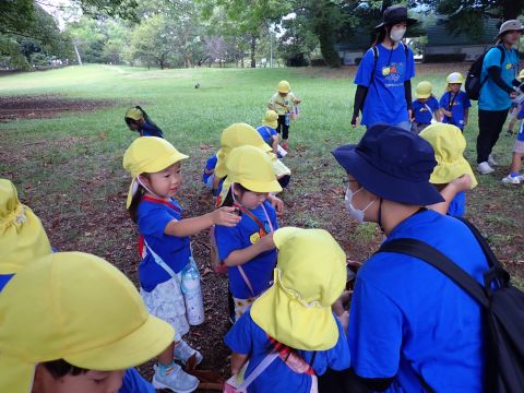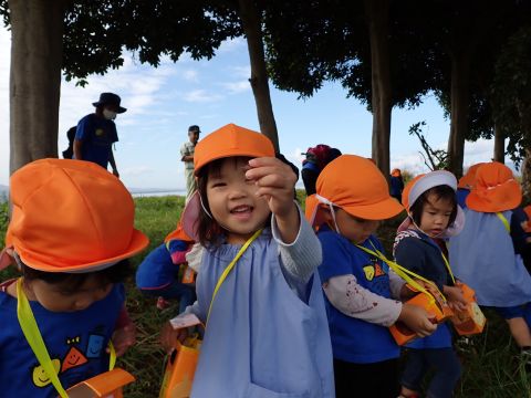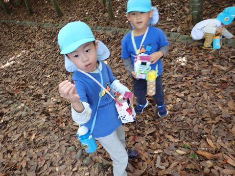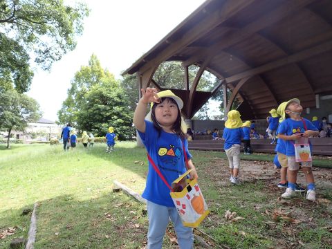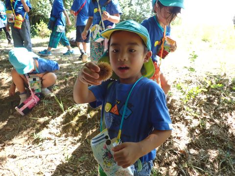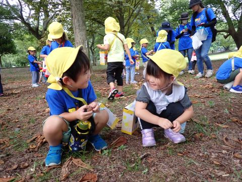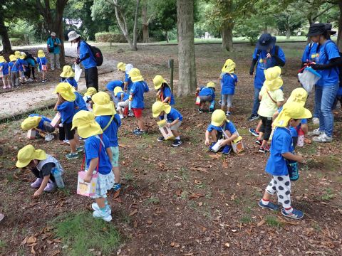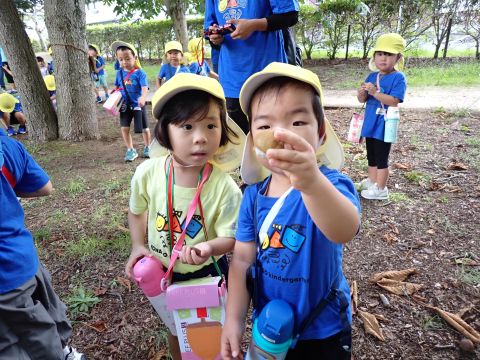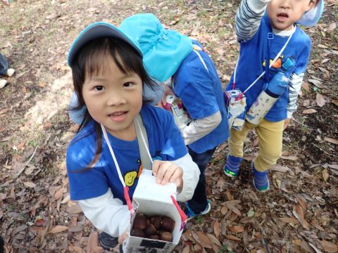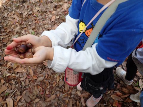 古代の丘公園まで遠足に行きました。公園に着くと、たくさんのどんぐりや木の実を見つけました。みんなが、夢中になってどんぐりを拾っていました!その他にも、セミの抜け殻やかたつむりなど、木の実以外にもたくさんのものを発見しました。「見てみて!いっぱいひろったよ!」「からから音がする~」とどんぐりバックを見せてくれたり、音を鳴らしたりと、大興奮の子どもたちでした☺✨