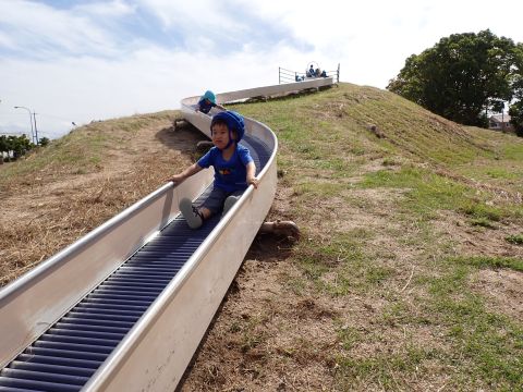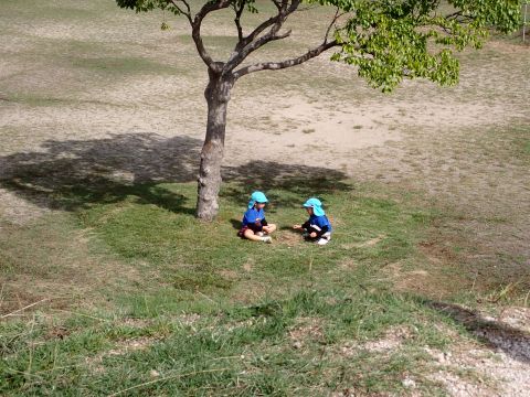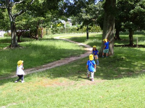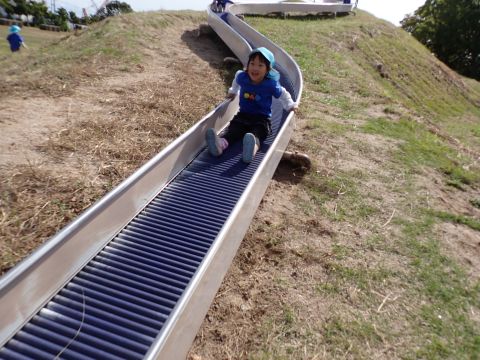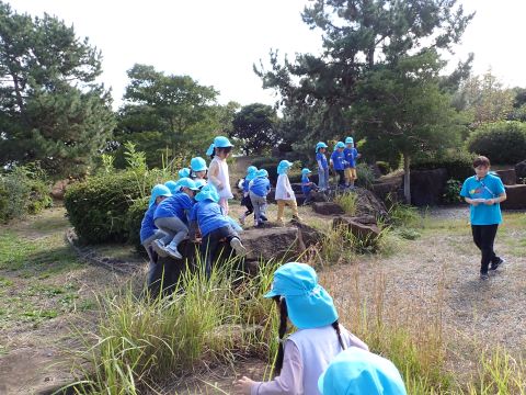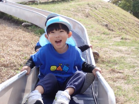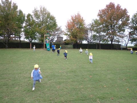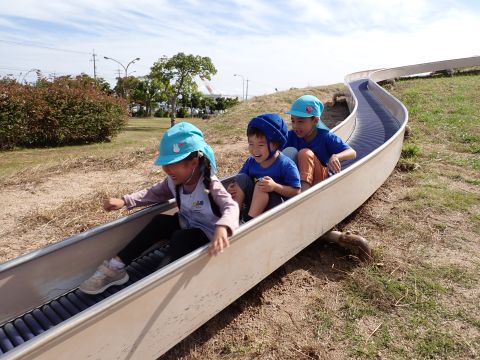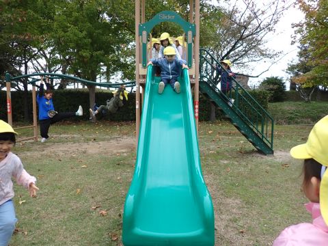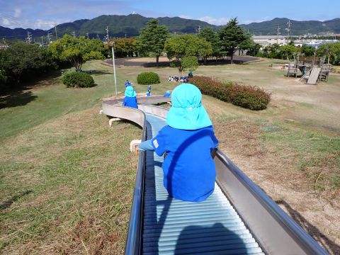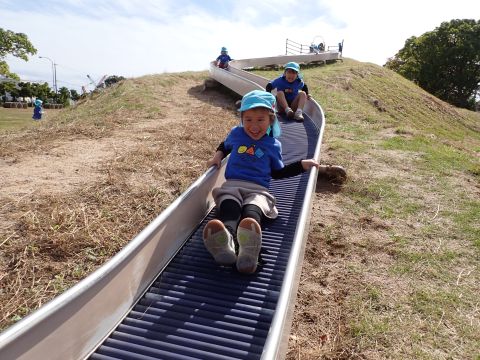 など様々などんぐりを見つけ、夢中になって拾っていました。中には、お散歩バックには入りきらず、ビニール袋がいっぱいになるほど見つけている子もいました。ほかにも、たくさんの落ち葉の上を歩き、「シャカシャカ」となる様子を楽しんだり、紅葉に葉が色づき始めていることに気づき、皆で観察したりして過ごしました。木陰にレジャーシートを広げ、おにぎり弁当を食べ終えた後は公園名物の滑り台を楽しみました。ローラー滑り台であることから、「お尻がむずむずする」「お尻がかゆい!」など大笑いの子どもたちでした。