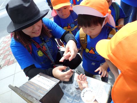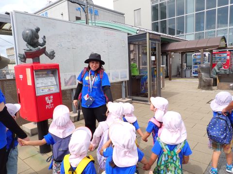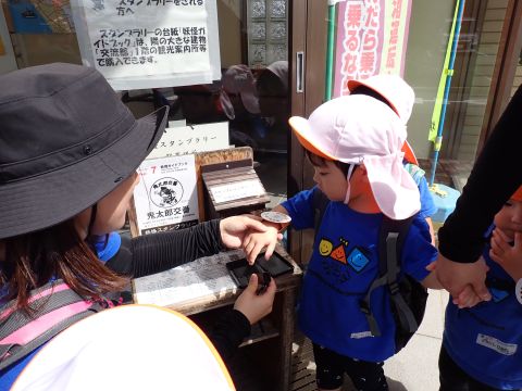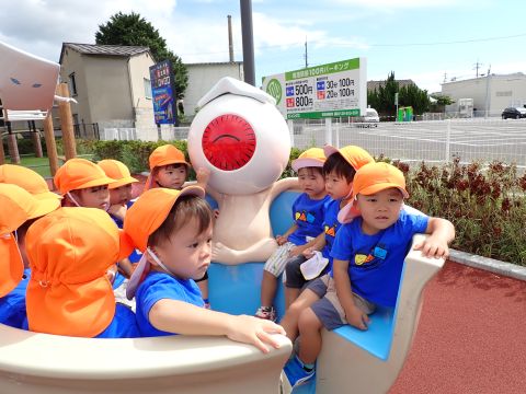 2歳児組のこどもたちが、園バスに乗って鬼太郎ロードに行って来ました!当日までに、鬼太郎の手遊びをしたり、園の中で鬼太郎ロードに見立てた道でスタンプラリーごっこで歩いてみたりして、この日をとっても楽しみにしていた子ども達。