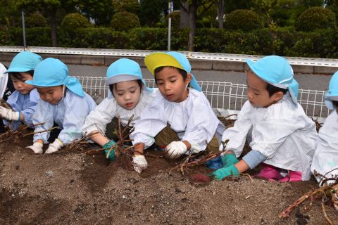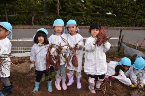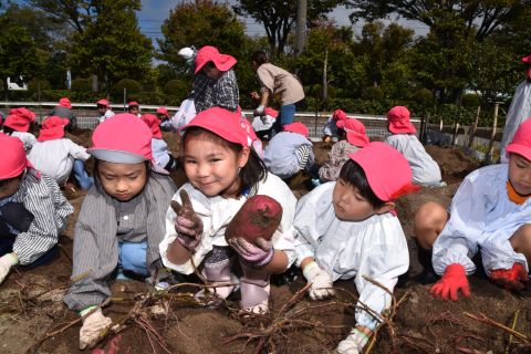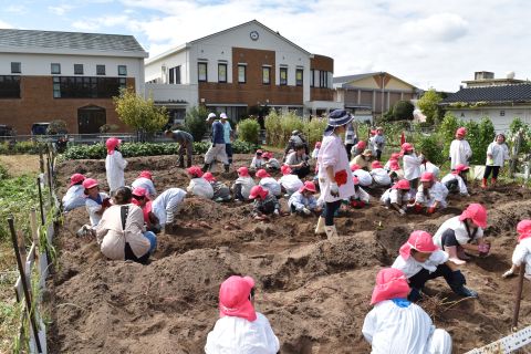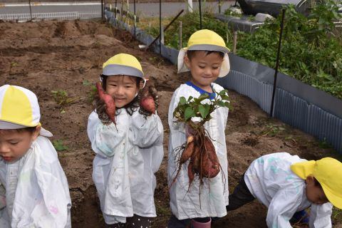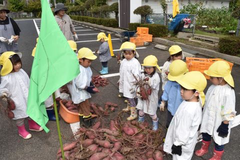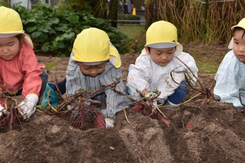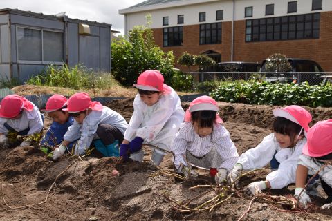 全園児が園の菜園で、クラス毎にサツマイモを収穫しました。