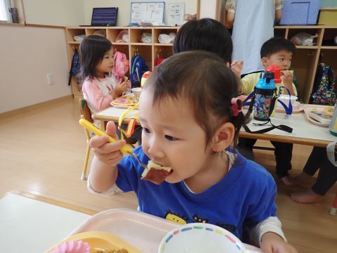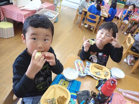 お昼に、お弁当と一緒にふかしいもをいただきました。自分たちで掘ったおいもはとてもおいしかったみたいで、「おいしい~♪」とすぐに平らげていましたよ☆