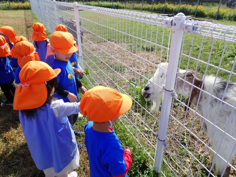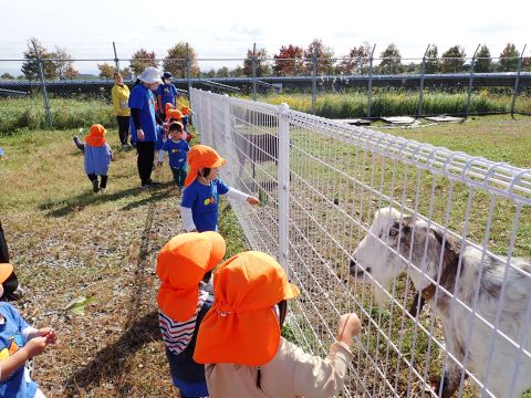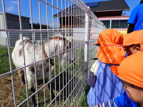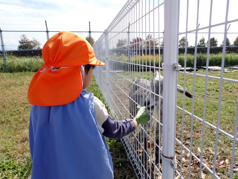 到着すると館長さんにどんぐりがたくさん落ちている林を教えてもらいました。小さいどんぐり、帽子つきどんぐり、細いどんぐりと色々な種類があり、子ども達もどんぐりバックがパンパンになるまで詰め込んでいましたよ。すぐ側の海には、カモの大群が気持ちよさそうに泳いでいたので「かもさーん!!」と大きい声で呼ぶ姿もありました。美味しいおにぎりとおやつを食べた後は、ヤギに餌やりもしました。始めは恐くて近づけない子もいましたが、赤ちゃんヤギに一回あげることができると「もう一回!」「まだあげたい!!」と何度も楽しむことが出来ました。帰りにはヤギの可愛い缶バッチのプレゼントもいただき、大満足そうな子ども達でした☺拾ったどんぐりは、どんぐり迷路にしたり、製作で使ったりして楽しみたいと思います。