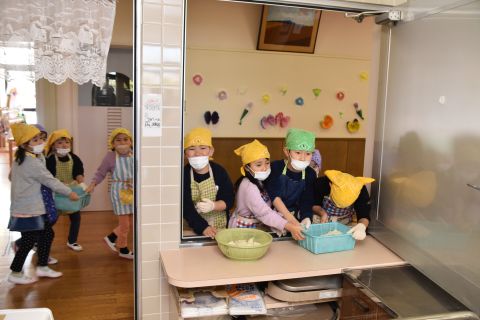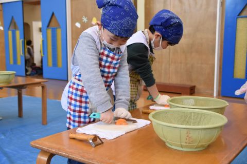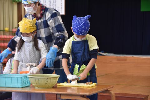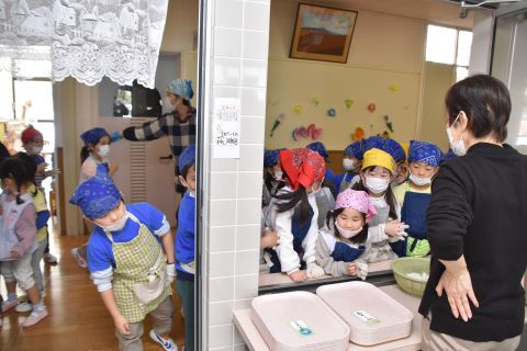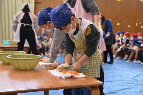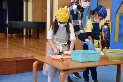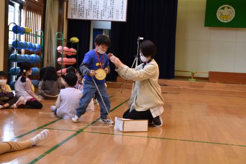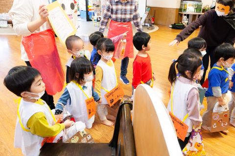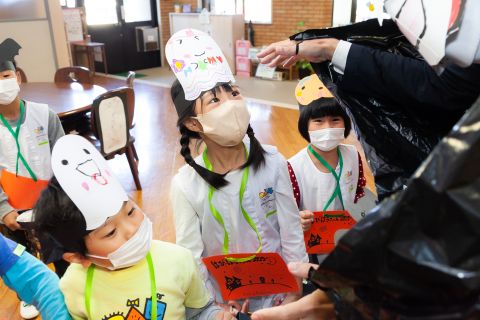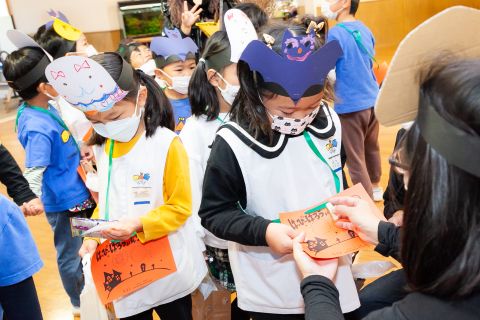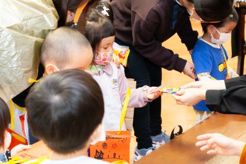 年長組のお兄さんお姉さんが、小さい組のお友だちに手作りのプレゼントを渡しました。