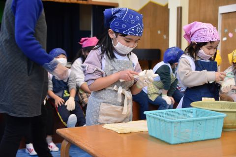 子どもたちは強い心で力を合わせて、豆を「鬼は外!福は内!」と力いっぱい投げました。