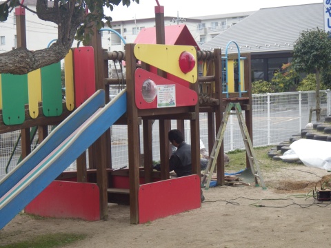 ジャングルジム及びひよこ組園庭の滑り台の補修は完了し、現在は総合遊具の補修をしています。