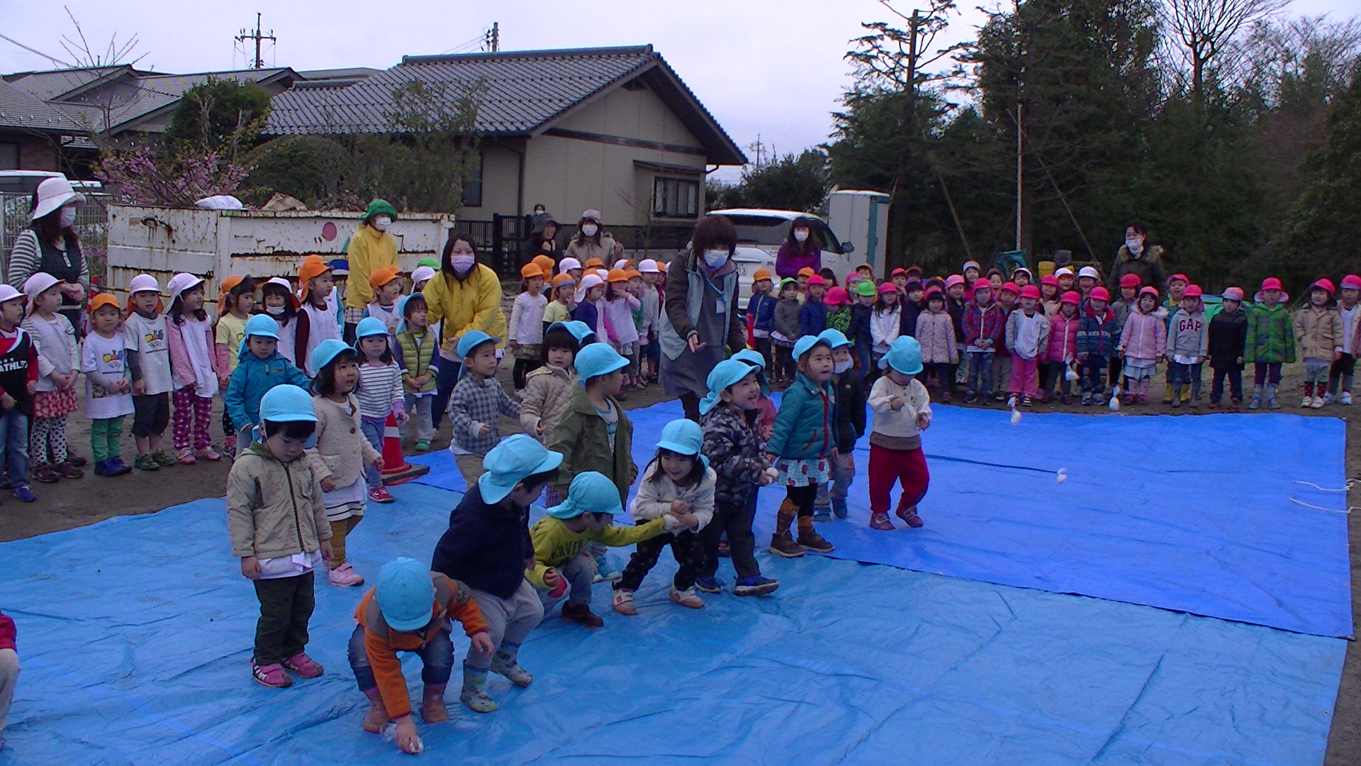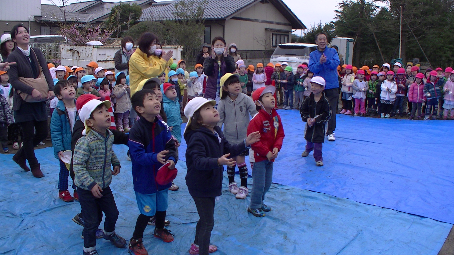 棟上げ自体は16日に行いましたが、卒園式等もあり、日程的に餅まきが難しかったのですが、お祝い事ですし、子どもたちにも経験をして欲しいと思い、計画しました。