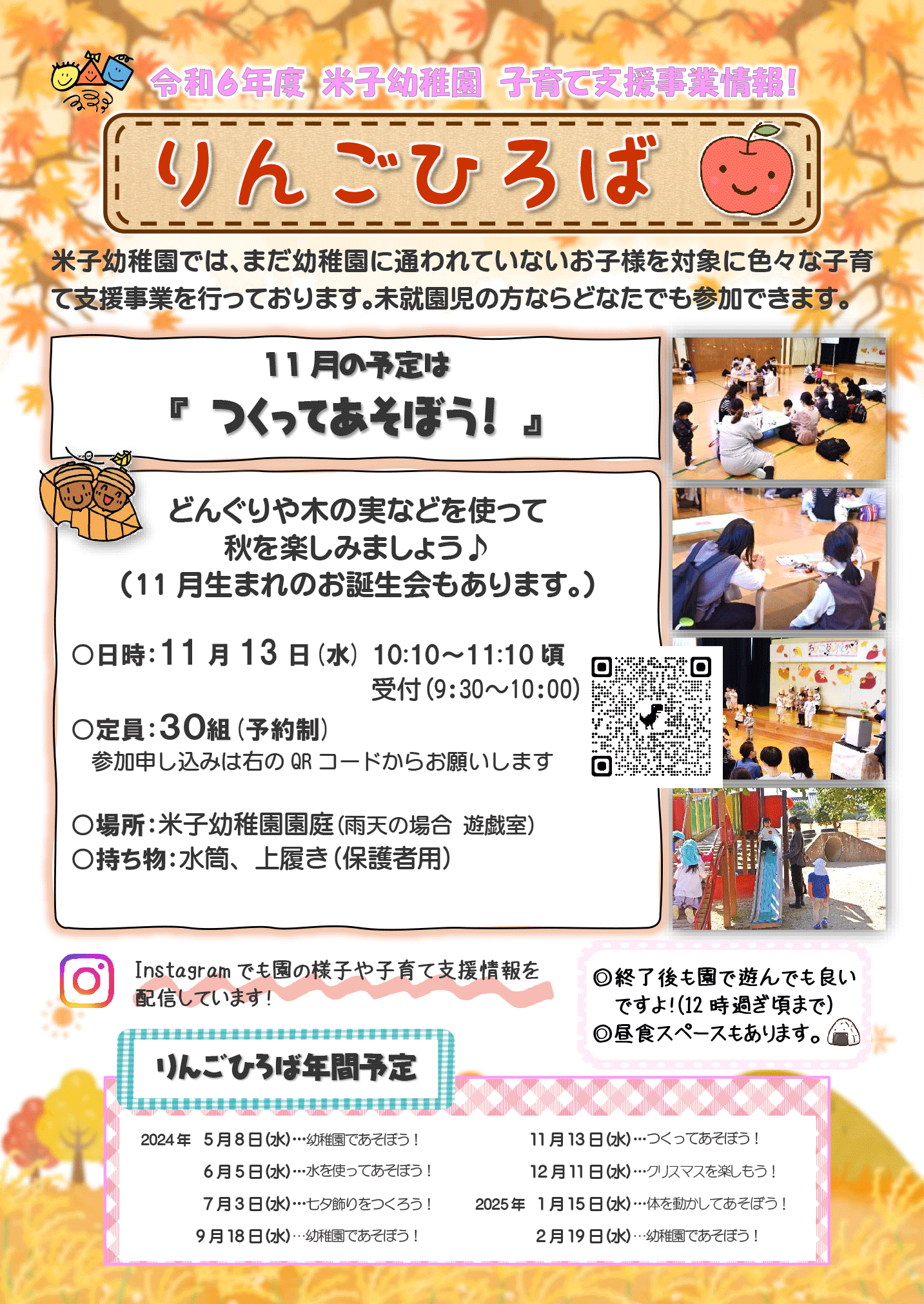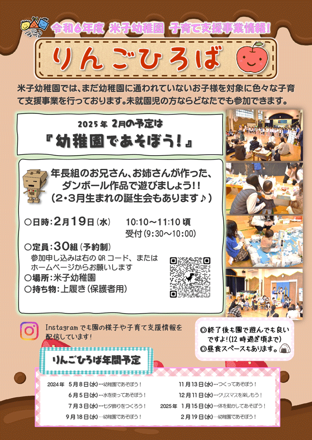 米子幼稚園では、まだ幼稚園に通われていないお子様を対象に色々な子育て支援事業を行っております。未就園児の方ならどなたでも参加できます。