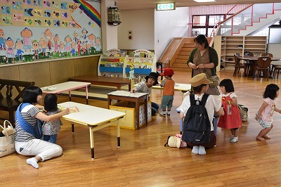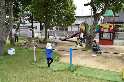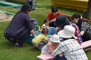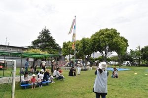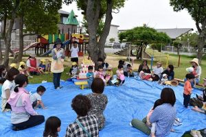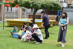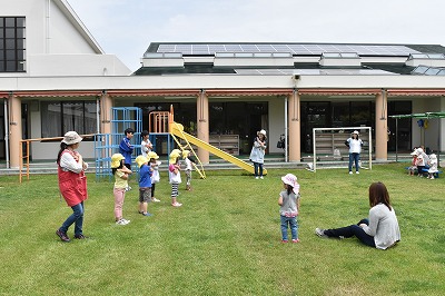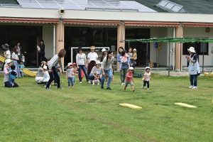 第1回目は「みんなでピクニックをしよう!」ということで、16組の親子のみなさんがお弁当を持って来てくださいました! この日は5月にしては朝から気温が高く、蒸し暑いほどのお天気でしたが、子どもたちは元気いっぱい園庭で楽しんでいましたよ♪