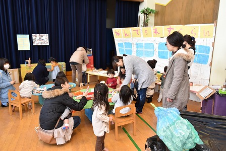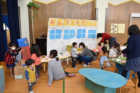 みんなで、青空を泳ぐこいのぼりを見ながら、年長組のお兄さんお姉さんと一緒に「こいのぼり」の歌ををうたったり、「どうぶつ体操」をしたりしました!