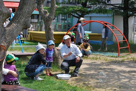 気持ちのいい天気の中、園庭でお気に入りの遊具で遊んだり、芝生の上を走ったり、たくさんのニコニコ笑顔が見られました!