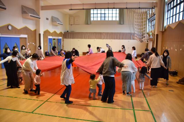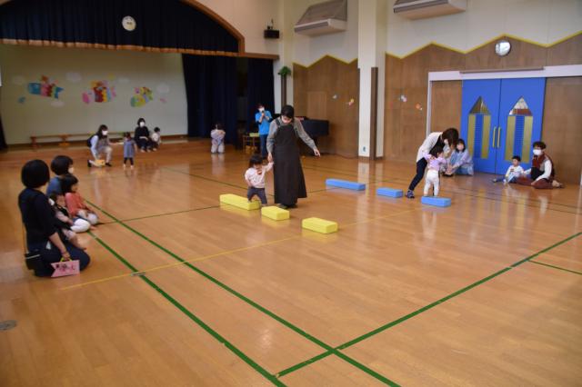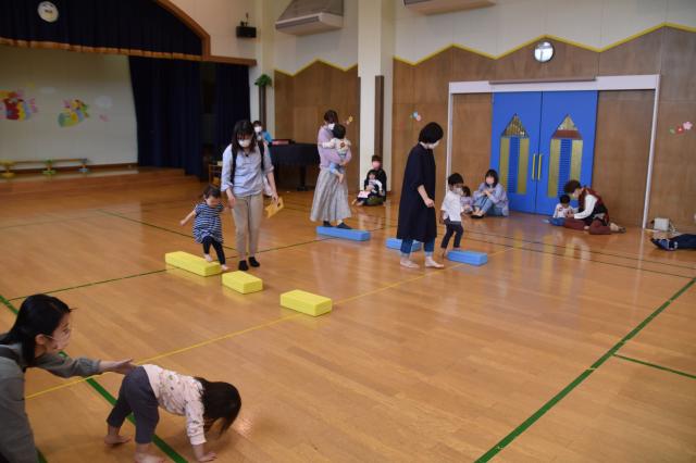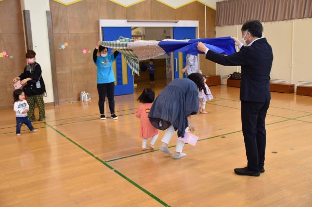 「よ~いどん!」 親子で一本橋を渡ったり、園長先生の持った大きな布の下をくぐったりするかけっこもしました。