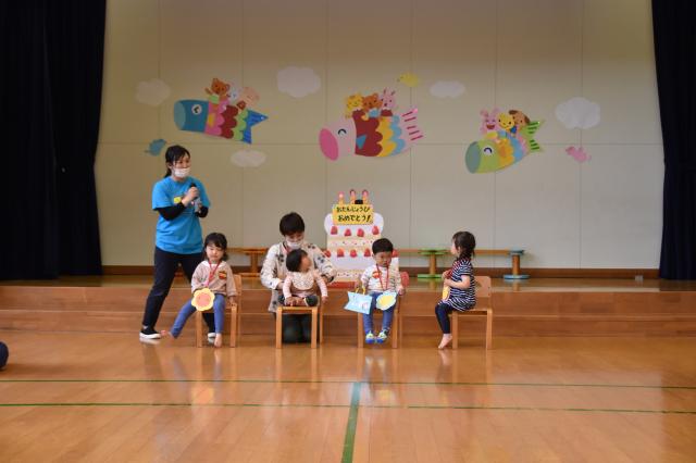 4、5月生まれの誕生会では、「たんたんたんたん たんじょうび~♫」とみんなで歌をうたったり、拍手をしたりしてお祝いしました。これからもすくすく大きくな~れ♪