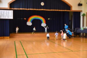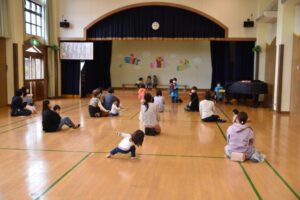 そのあと遊戯室で集まり、みんなで『こいのぼり』を歌い、『どうぶつ体操』をして体を動かしました。