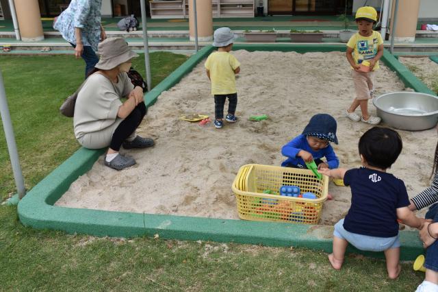 朝は曇り空だった空も、ひろば終了後は日が射していいお天気になっていました。 そのまま園庭で、すべり台やぶらんこをしたり、砂場をしたり、芝生をかけ回ったりしてゆっくりと遊んでおられました。