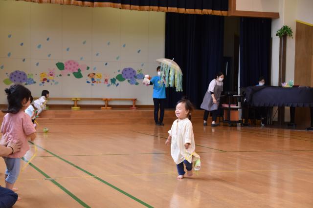 雨降りの中、楽しそうな声を聞きつけて、遊びにやって来たお友だちを、「だれかな?だれかな?」と当てっこして、楽しみました!