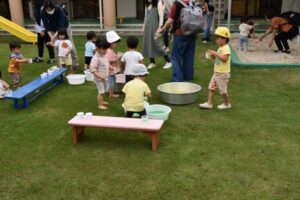次は、園庭に移動して、「水を使ってあそぼう!」のスタートです!