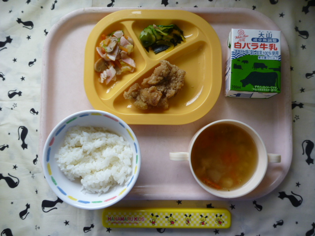 みんな大好き★竜田揚げ★(2020/01/24) ★ ごはん◆ 鶏の竜田揚げ◆●白菜ベーコン煮◆●海藻サラダ● コンソメスープ ※あたたかいご飯・スープはおかわり自由です。※牛乳は年長希望者のみです。★熱や力になるもの ◆血や肉になるもの ●体の調子を整えるもの ツイート