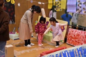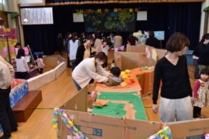 今回は、年長組のお兄さん、お姉さんが、作品展に向けて力を合わせて作った大型作品で遊びました!