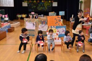 今回は、年長組さんがタンバリンや、カスタネットをたたいての伴奏付きで、「たん たん たん たん たんじょうび~♪」とみんなで一緒に歌って、5人のお友だちを賑やかにお祝いしました!これからも、元気にすくすく大きくなってね!