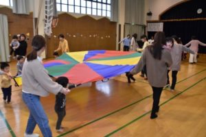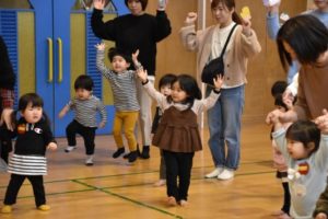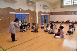 遊戯室に集まって、「おはようございま~す!」のごあいさつから始まり、名前を呼ばれたら「はーい!」と元気にお返事もできました! 『動物体操』をして体をほぐし、運動会でお馴染みの「バルーン」をみんなで楽しみました!!