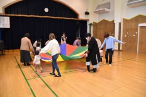 お母さんの横で、小さな手でしっかりバルーンを持って、フリフリと振ったり、片手を飛行機みたいに伸ばして回ってみたり…。ピーンとバルーンを引っ張ってから、上にあげてサッと下におろすと、バルーンの中に空気が入ってポコンと大きなドームのようになるのが、面白くてたまらない様子のちびっこたち♪