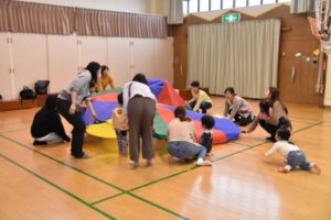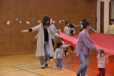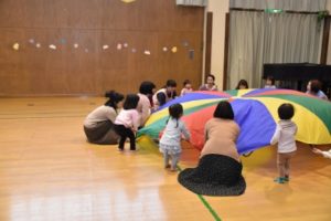 大きなバルーンでは、『ぼよよん行進曲』に合わせて。 曲のフィナーレはお母さん子どもたち、み~んなバルーンの中に入っちゃいました(^^)/ 「キャー♡」「わぁ!」バルーンの中では、親子で顔を見合わせたり、子どもたちは走り回ったり、満面の笑顔がいっぱいでした♫