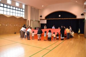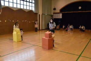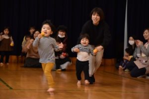 リスさんと、クマさんのお口に、新聞紙を丸めたリンゴとミカンを入れるリレー式のかけっこもしました。