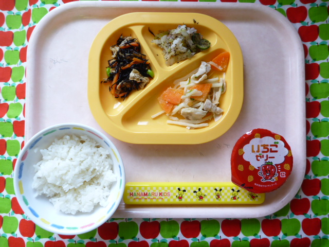 お肉と一緒にご飯も食べよう!(2020/05/01) ★ ごはん◆●豚とたけのこの味噌炒め◆●ひじき煮● ゆかり和え★ いちごゼリー ※あたたかいご飯はおかわり自由です。※牛乳は年長希望者のみです。★熱や力になるもの ◆血や肉になるもの ●体の調子を整えるもの ツイート