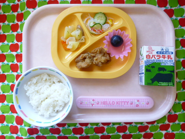 みんな大好き★唐揚げだ♪(2020/06/22) ★ ごはん◆ 鶏の唐揚げ● コンソメ煮◆●春雨サラダ● ぶどう ※あたたかいご飯はおかわり自由です。※牛乳は年長希望者のみです。★熱や力になるもの ◆血や肉になるもの ●体の調子を整えるもの ツイート