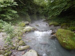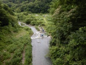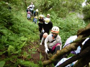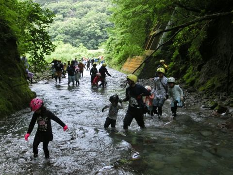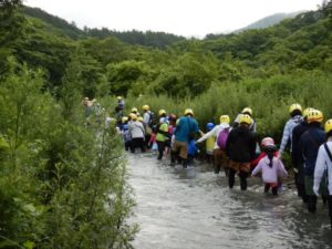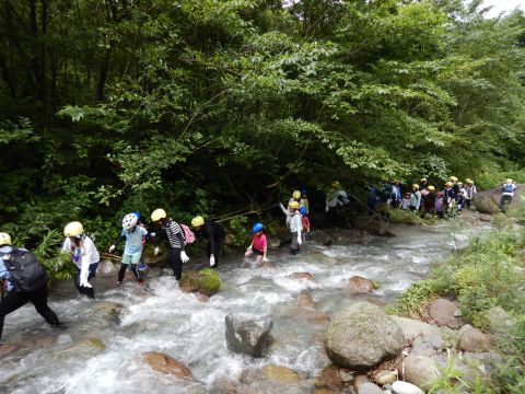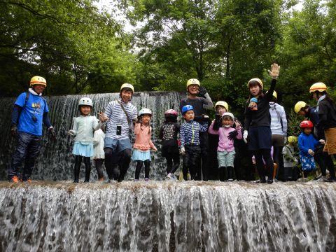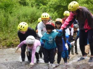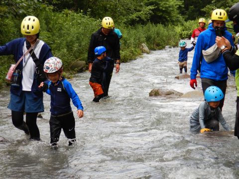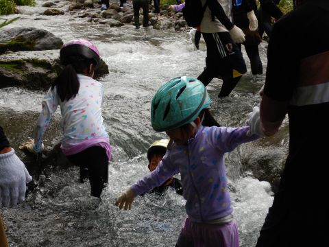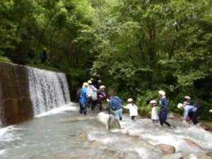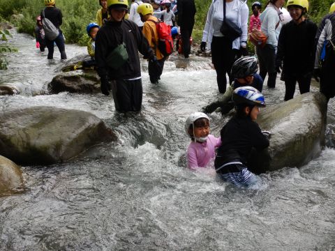 親子、職員合わせて100名程のグループになりました。大山に流れる川の中をスタート地点からゴール地点まで歩いて探検!途中、深いところや流れが強い場所、滝などがありダイナミックな自然を体験しながら川の中を歩きました。深い場所や流れが強いところで楽しく遊ぶ親子♪辛くて、泣いてしまう子もいましたが、お友だちや保護者さん、先生たちと励まし合い、がんばってみんなでゴールまで行くことができました。今年の夏の良い思い出になりました。