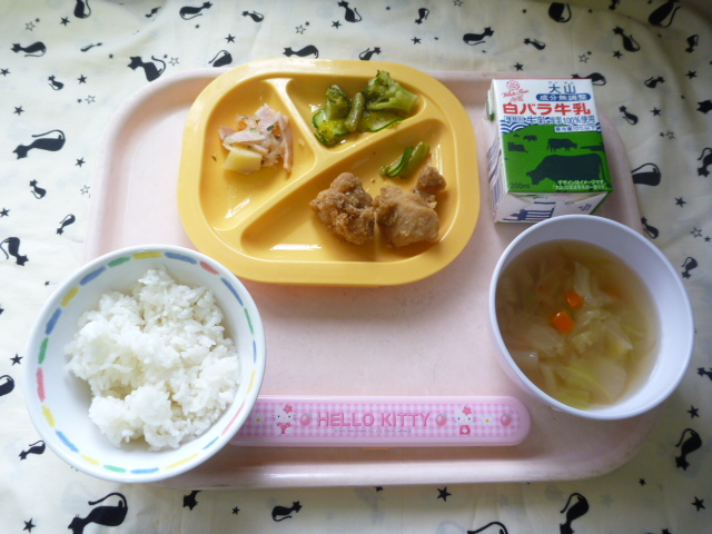 みんな大好き☆唐揚げだ♪(2020/09/16) ★ ごはん◆ 鶏の唐揚げ★◆●ジャーマンポテト● グリーンサラダ● コンソメスープ ※あたたかいご飯・スープはおかわり自由です。※牛乳は年長希望者のみです。★熱や力になるもの ◆血や肉になるもの ●体の調子を整えるもの ツイート