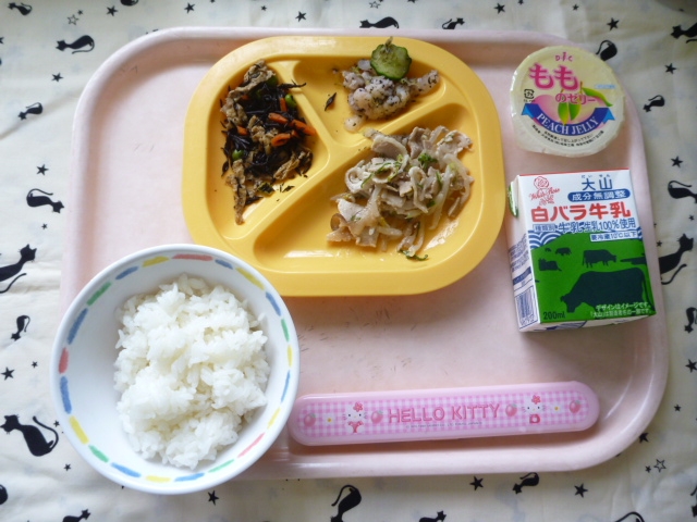ひじきは「鉄分の王様」です☆(2020/09/25) ★ ごはん◆● 豚もやし炒め◆● ひじき煮● ゆかり和え★ ももゼリー ※あたたかいご飯は、おかわり自由です。※牛乳は年長希望者のみです。★熱や力になるもの ◆血や肉になるもの ●体の調子を整えるもの ツイート