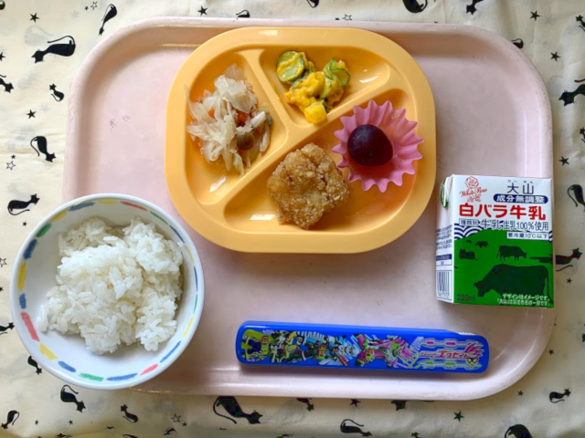 カロテン豊富☆黄色いサラダ(2020/10/19) ★ ごはん◆ タラのカレー揚げ◆●キャベツツナ炒め★●かぼちゃサラダ● ぶどう ※あたたかいご飯は、おかわり自由です。※牛乳は年長希望者のみです。★熱や力になるもの ◆血や肉になるもの ●体の調子を整えるもの ツイート